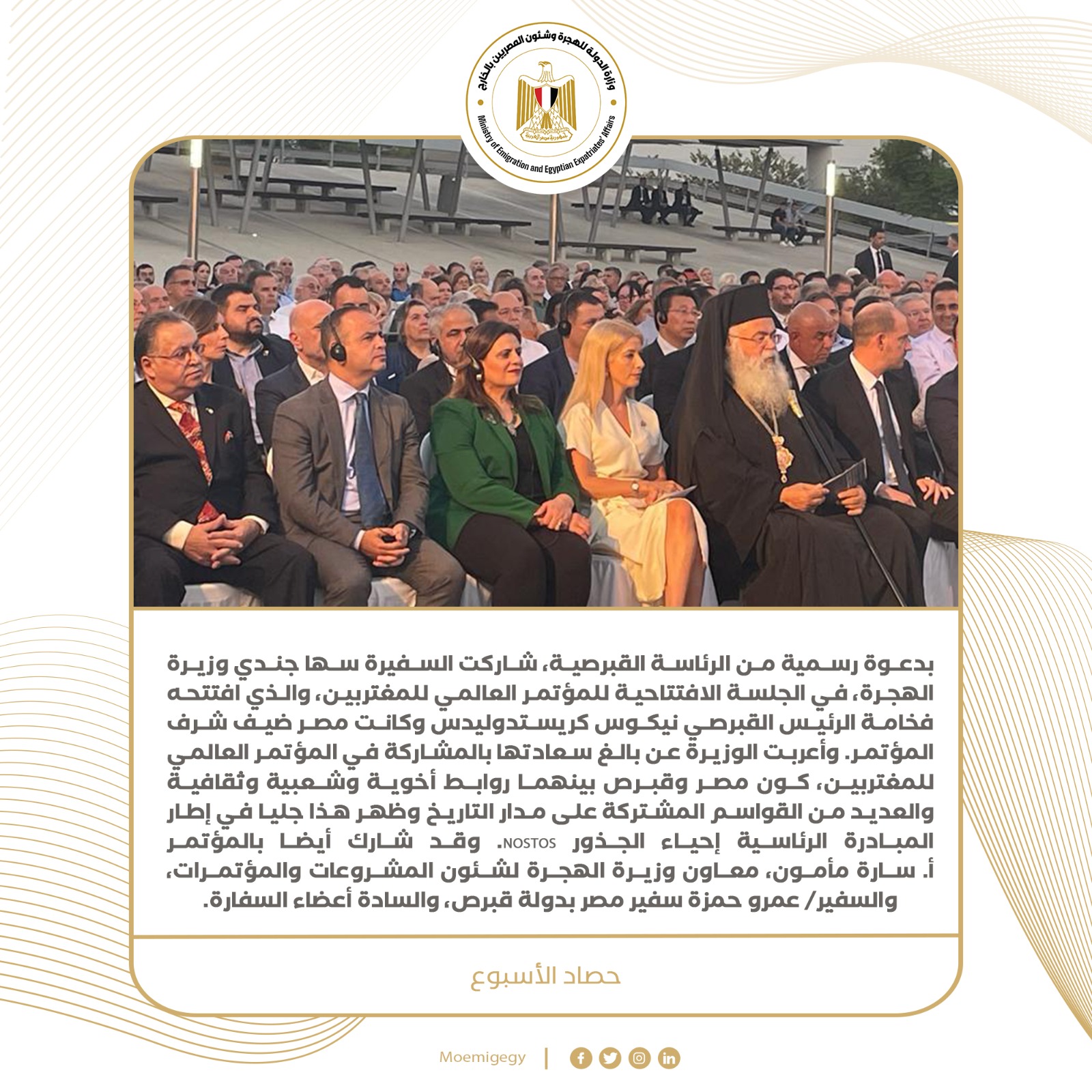 وبدعوة رسمية من الرئاسة القبرصية، شاركت السفيرة سها جندي وزيرة الهجرة، في الجلسة الافتتاحية للمؤتمر العالمي للمغتربين، والذي افتتحه فخامة الرئيس القبرصي نيكوس كريستدوليدس وكانت مصر ضيف شرف المؤتمر.