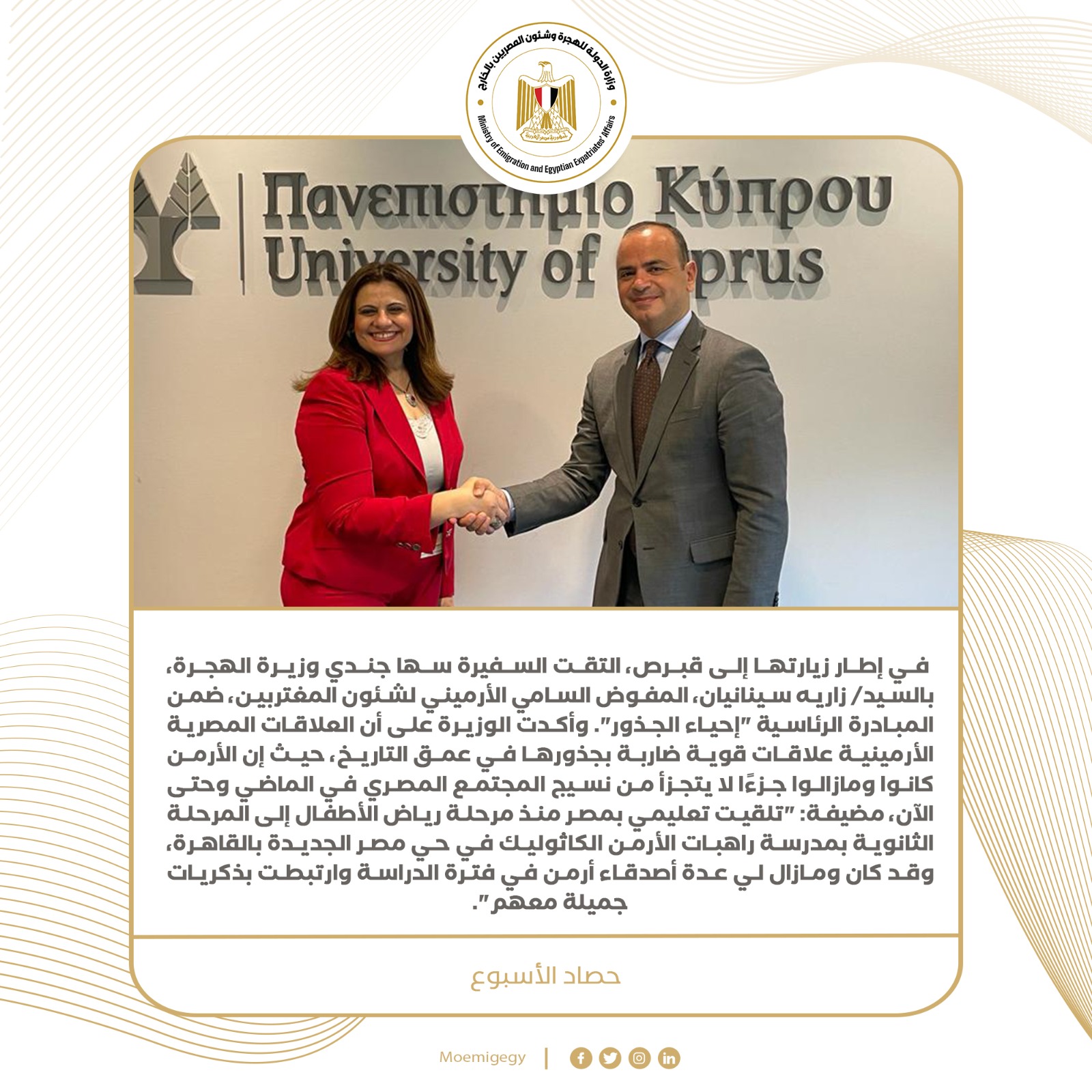 و في إطار زيارتها إلى قبرص، التقت السفيرة سها جندي وزيرة الهجرة، ب زاريه سينانيان، المفوض السامي الأرميني لشئون المغتربين، ضمن المبادرة الرئاسية "إحياء الجذور".