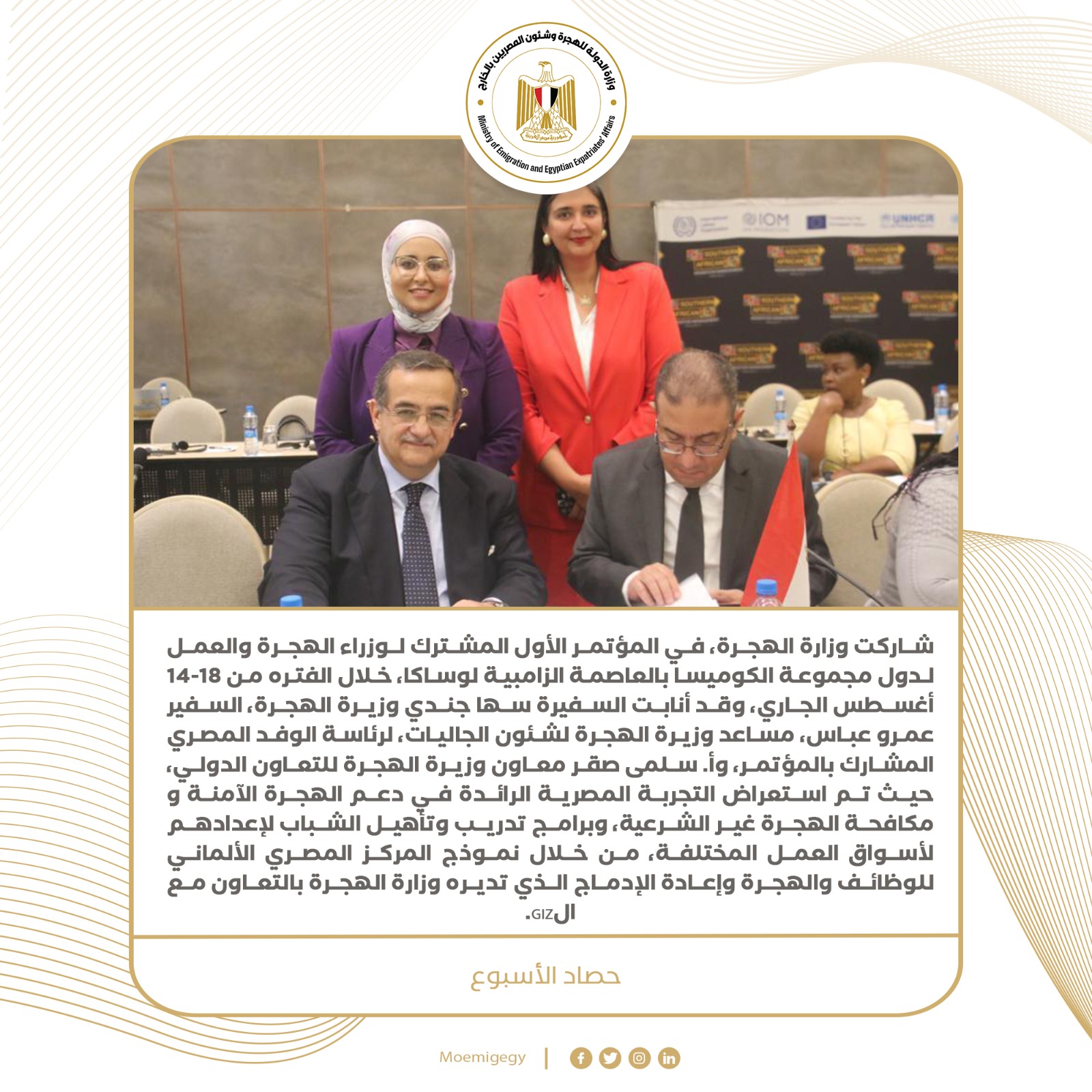 وشاركت وزارة الدولة للهجرة وشئون المصريين بالخارج، في المؤتمر الأول المشترك لوزراء الهجرة والعمل لدول مجموعة الكوميسا بالعاصمة الزامبية لوساكا، خلال الفتره من ١٤-١٨ أغسطس الجاري، وقد أنابت السفيرة سها جندي وزيرة الهجرة، السفير عمرو عباس، مساعد وزيرة الهجرة لشئون الجاليات، لرئاسة الوفد المصري المشارك بالمؤتمر، وسلمى صقر معاون وزيرة الهجرة للتعاون الدولي.