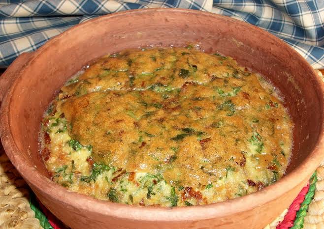 ويخلط الخليط مع البيض والجبن والزيت ويوضع في صينية فرن مدهونة