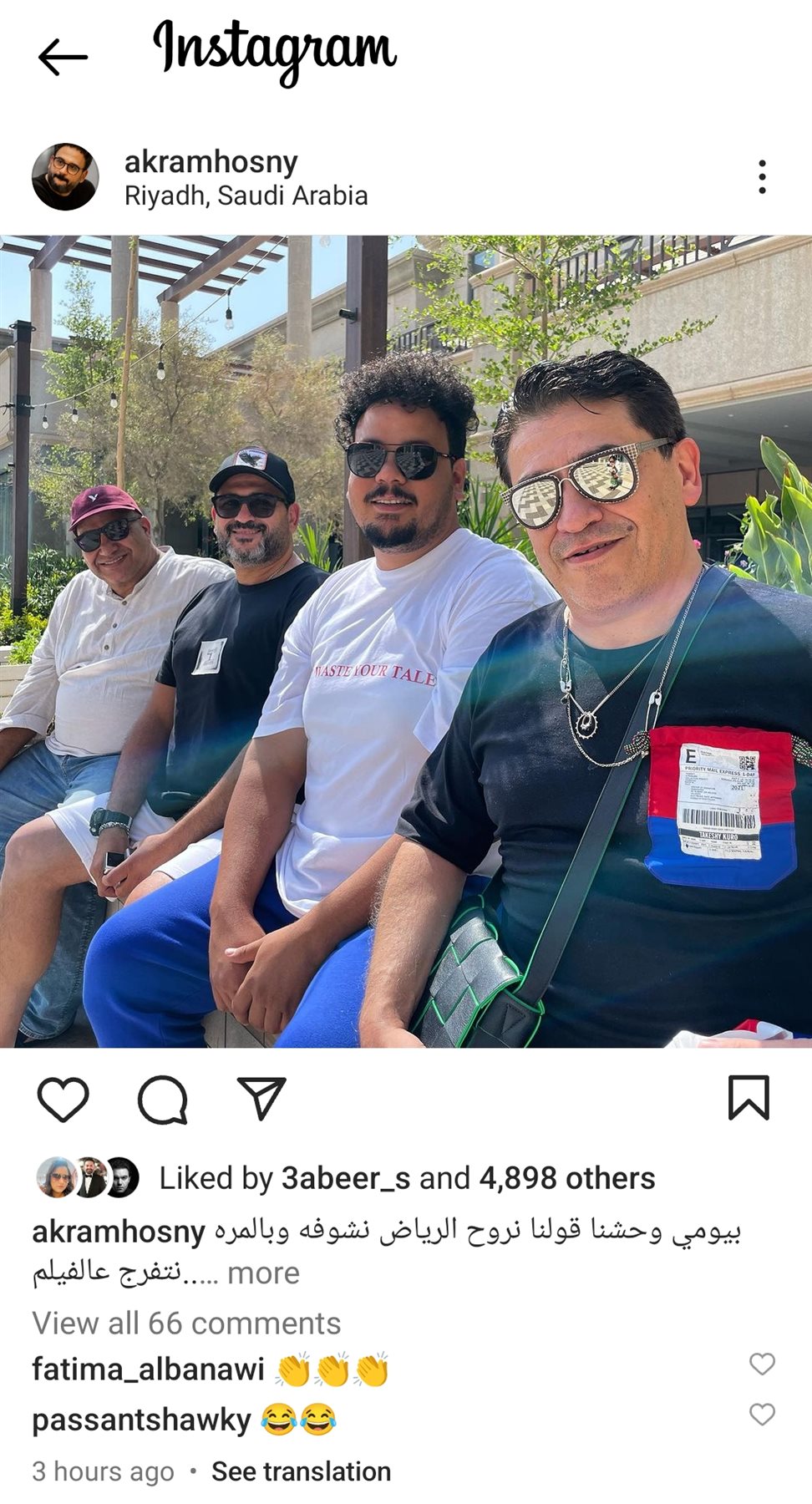 ونشر أكرم حسني صورة تجمعه بمصطفى غريب وبيومي فؤاد اللذان يشاركانه بطولة العمل، معلقًا عليها "بيومي وحشنا قولنا نروح الرياض نشوفه وبالمره نتفرج عالفيلم، العميل صفر في المملكة العربية السعودية".