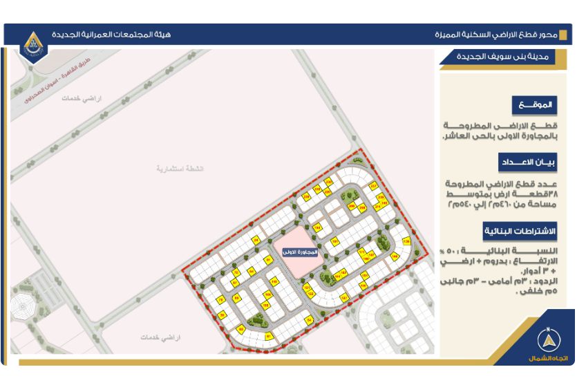 وتطرح بمدينة بني سويف الجديدة 38 قطعة بمساحات تتراوح ما بين 460 - 540 مترا مربعا بسعر 3765 جنيها للمتر، وحددت الوزارة قيمة جدية الحجز بـ 100 ألف جنيه و500 جنيه مصاريف إدارية.