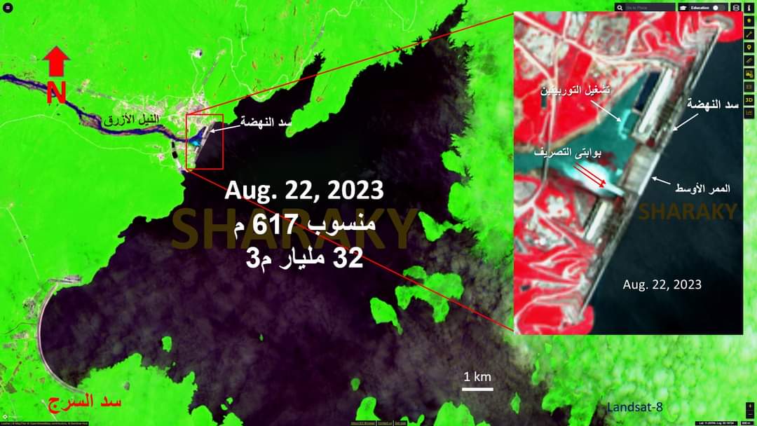 وأضاف الدكتور عباس شراقي "تغطى مياه بحيرة سد النهضة ثلث سد السرج حتى 22 أغسطس 2023, والذي يرتفع 50 مترًا عن أرضية الوادى ومن المتوقع أن تصل المياه إلى منتصفه بنهاية التخزين الرابع عند منسوب 625 م".