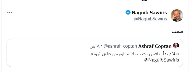 وعن منافسة ثروة محمد صلاح لثروته كتب المهندس نجيب ساويرس تغريدة عبر تويتر «منصة اكس الحالية»: «صعب».