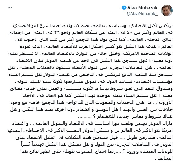 واختتم علاء مبارك حديثه عن مجموعة البريكس متسائلًا: "فهل ستنجح هذه التكتلات في تقليل الاعتماد على الدولار في التعاملات التجارية بين الدول وهل يشكل هذا التكتل تهديدًا كبيرًا للولايات المتحدة وأوروبا؟…..ربما نحتاج لسنوات طويلة حتى تظهر نتائج هذا التحالف."