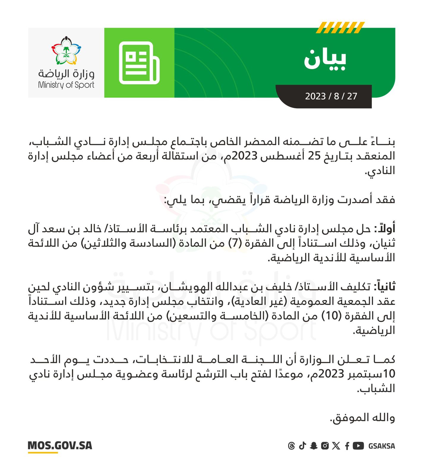 أولًا: حل مجلس إدارة نادي الشباب المعتمد برئاسة خالد بن سعد آل ثنيان، وذلك استنادا إلى الفقرة (7) من المادة (36) من اللائحة الأساسية للأندية الرياضية.
