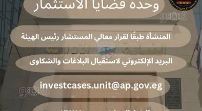 تتلقى "وحدة قضايا الاستثمار" شكاوى المستثمرين على مدار الساعة عبر البريد الإلكتروني الرسمي "INVESTCASES.UNIT@AP.GOV.EG"
