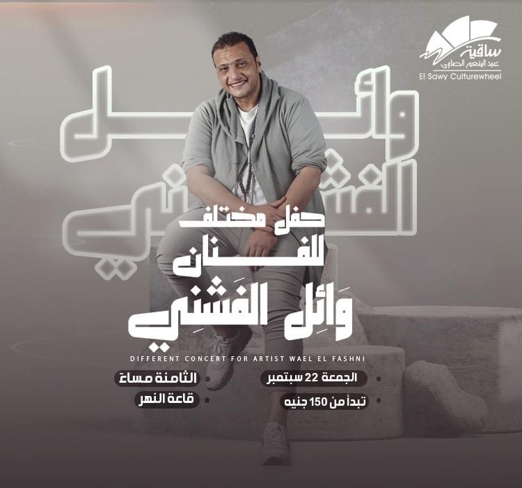 يحيي الفنان وائل الفشني حفلا غنائيا على خشبة مسرح قاعة النهر في ساقية الصاوي بالزمالك، وذلك في تمام الثامنة من مساء يوم الجمعة الموافق 22 سبتمبر المقبل.