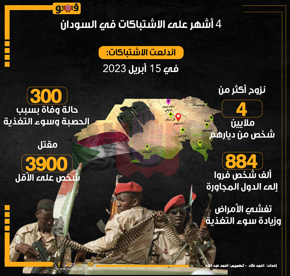 وتتواصل الاشتباكات بين الجيش السوداني والدعم السريع منذ أكثر من 4 أشهر، وتشهد البلاد اشتباكات عنيفة وواسعة النطاق، في مناطق متفرقة من السودان، تتركز معظمها في العاصمة الخرطوم، وخلفت المعارك حتى الآن مئات القتلى والجرحى بين المدنيين.