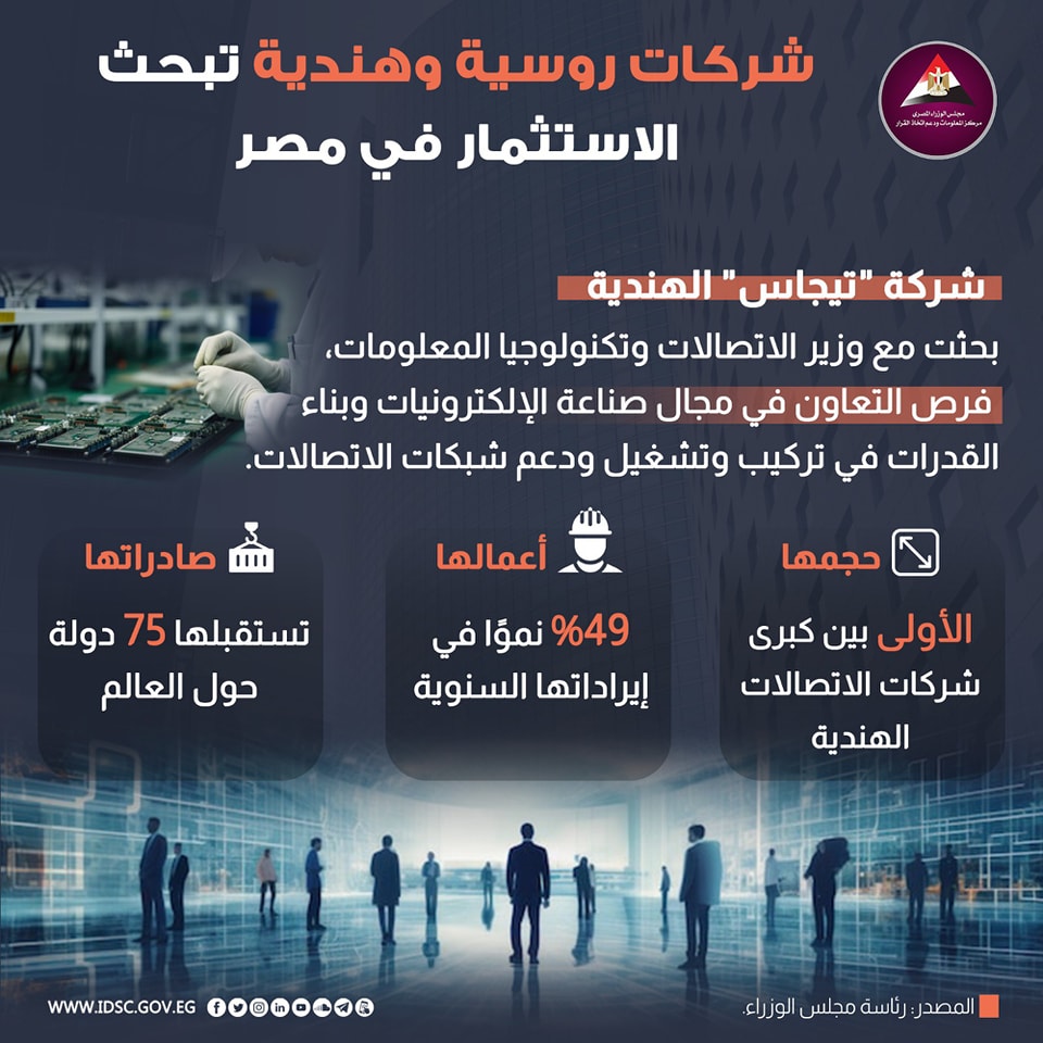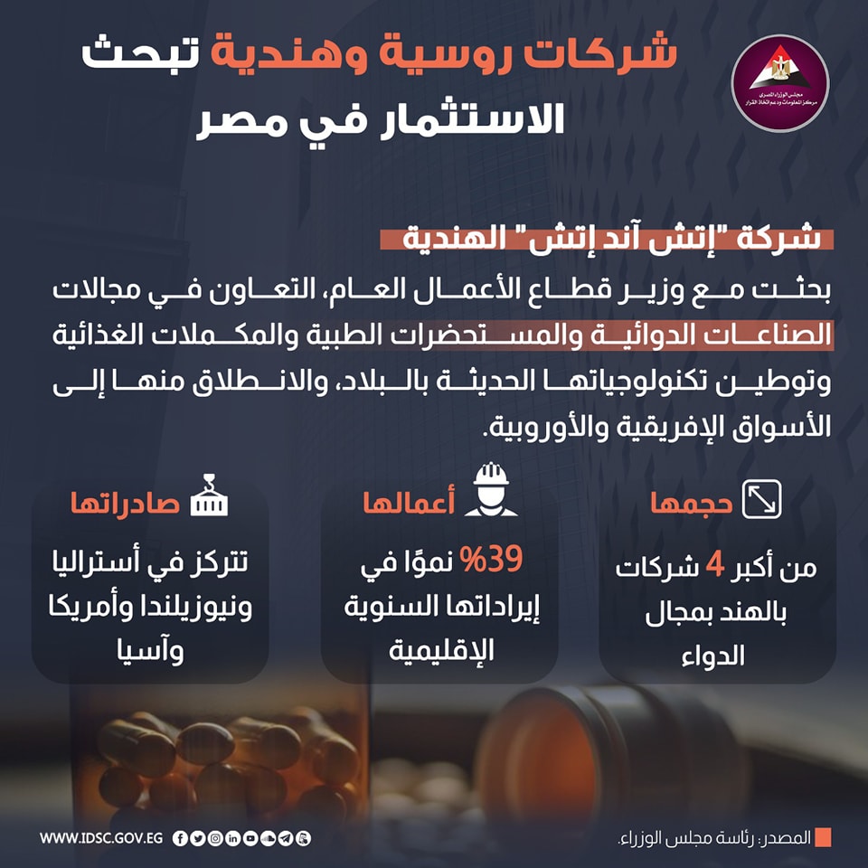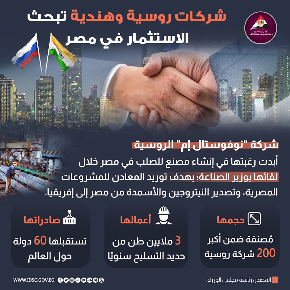 مكاسب مصر من الانضمام لـ البريكس، نشرت الصفحة الرسمية لمركز المعلومات ودعم اتخاذ القرار بمجلس الوزراء علي موقع التواصل الاجتماعي فيسبوك، انفوجراف، تحت عنوان (شركات روسية وهندية تبحث الاستثمار في مصر).