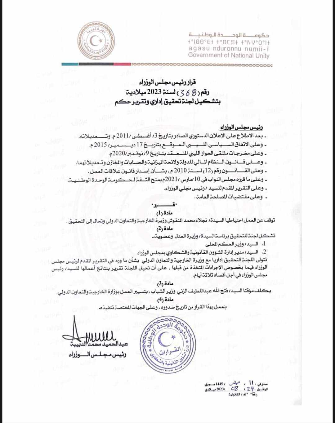 ونصت المادة الثانية من القرار على تشكيل لجنة للتحقيق برئاسة وزيرة العدل وعضوية وزير الحكم المحلي ومدير إدارة الشؤون القانونية والشكاوى بمجلس الوزراء، تكون مهمتها التحقيق إداريا مع نجلاء المنقوش وزيرة الخارجية والتعاون الدولي بشأن ما ورد في التقرير المقدم إلى رئيس مجلس الوزراء فيما يخص الإجراءات المتخذة من قبلها، على أن تحيل اللجنة تقرير بنتائج أعمالها لرئيس مجلس الوزراء في أجل أقصاه ثلاثة أيام.