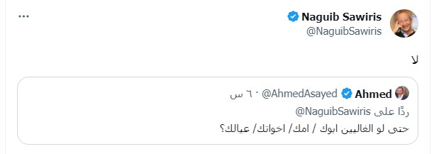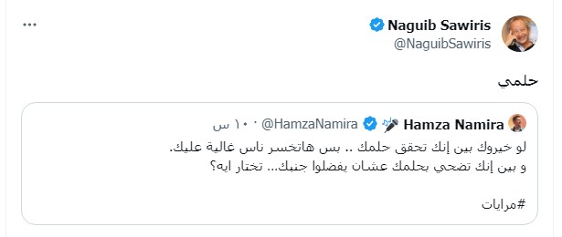 وهنا علق حمزة نمرة قائلًا: "أتمنى كمان أعرف إجابتك بعد ما تشوف الأغنية الأربع الجاي"، الأمر الذي دفع أحد متابعي المهندس نجيب ساويرس لتوجيه سؤال له قائلًا: "حتى لو الغاليين ابوك/ امك/ اخواتك/ عيالك؟"