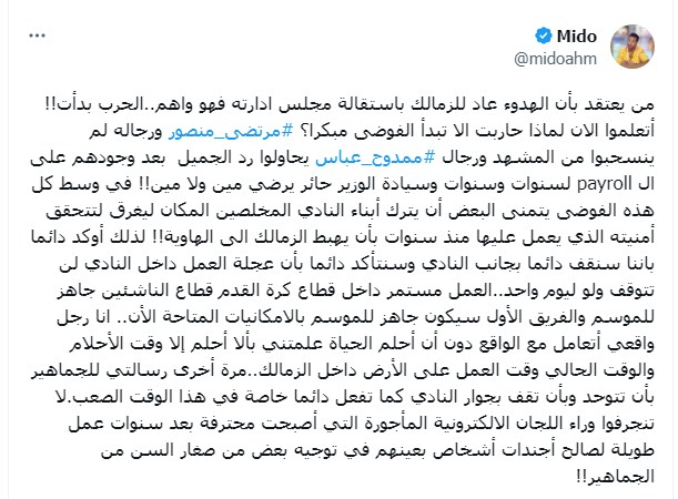 وتابع أحمد حسام ميدو قائلًا: "في وسط كل هذه الفوضى يتمنى البعض أن يترك أبناء النادي المخلصين المكان ليغرق لتتحقق أمنيته الذي يعمل عليها منذ سنوات بأن يهبط الزمالك الى الهاوية!"