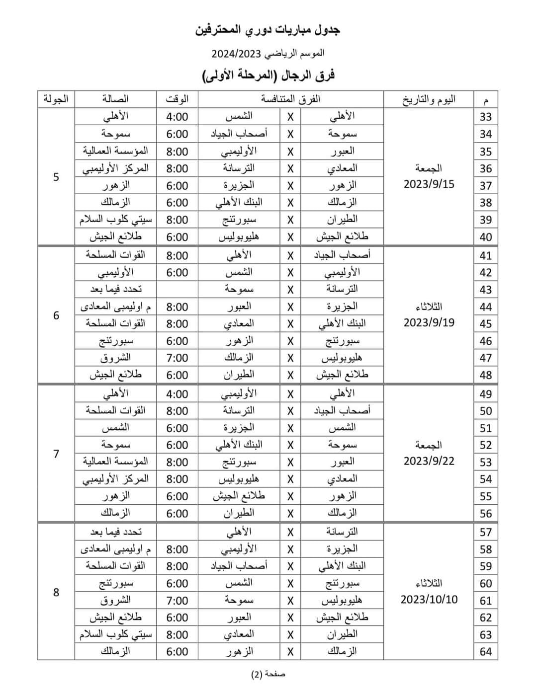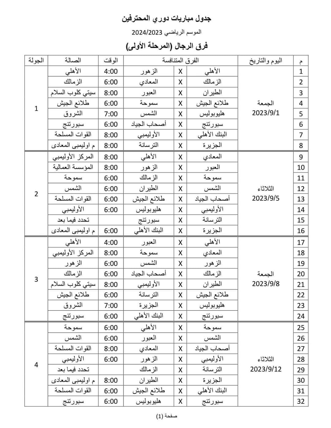 وجاء جدول المرحلة الأولى من دوري المحترفين كالتالي: