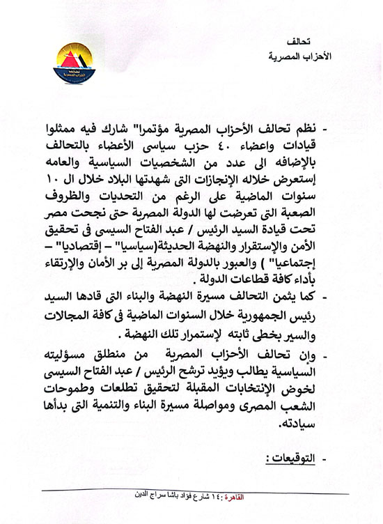 وأضاف البيان: إن تحالف الأحزاب المصرية من منطلق مسؤوليته السياسية يطالب ويؤيد ترشيح الرئيس عبد الفتاح السيسي لخوض الانتخابات الرئاسية المقبلة، لتحقيق تطلعات وطموحات الشعب المصري ومواصلة مسيرة البناء والتنمية التي بدأها سيادته.
