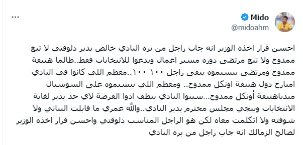 وكتب أحمد حسام "ميدو" عن أزمة نادي الزمالك، عبر تويتر، واختيار عماد العناني فقال: "احسن قرار أخذه الوزير أنه جاب راجل من بره النادي خالص يدير دلوقتي لا تبع ممدوح ولا تبع مرتضى دوره مسير أعمال ويدعوا للانتخابات فقط".