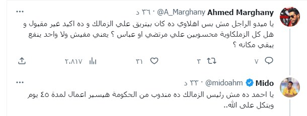 وعلق عليه أحد المتابعين على ميدو قائلًا: "الراجل مش بس اهلاوي ده كان بيتريق علي الزمالك وده اكيد غير مقبول وهل كل الزملكاوية محسوبين علي مرتضي او عباس؟ يعني مفيش ولا واحد ينفع يبقي مكانه؟"