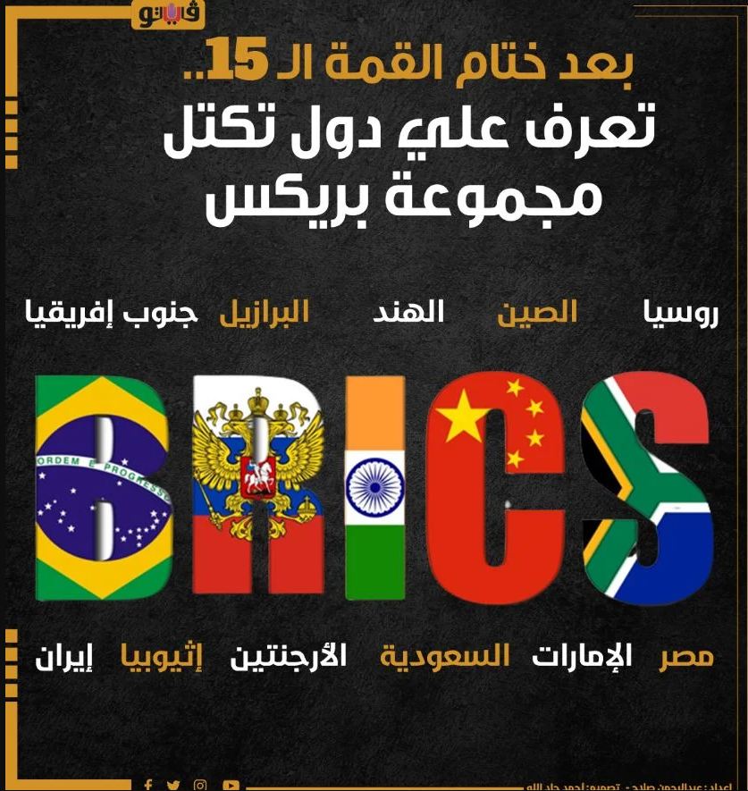 وقالت وكالة "بلومبرج" المتخصصة في الشأن الاقتصادي، إن توسع مجموعة بريكس، بضم 6 دول جديدة، يؤكد الطلب المتزايد على إيجاد بديل للنظام العالمي القائم بقيادة الغرب، ويشهد أيضا على فشل قيادة الولايات المتحدة.