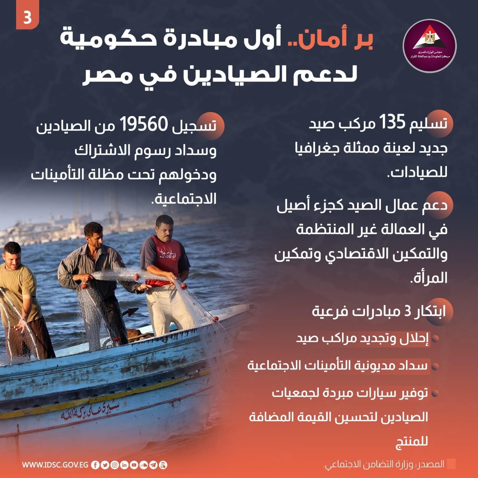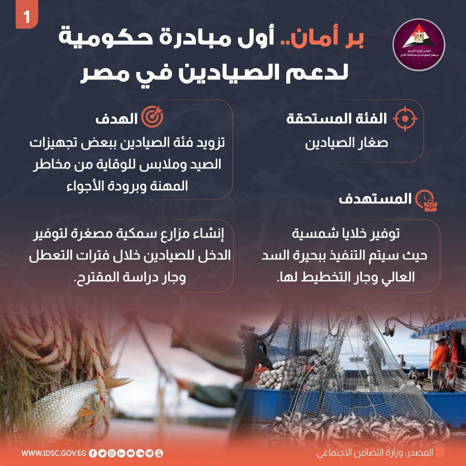 أطلقت وزارة التضامن الاجتماعي مبادرة بر أمان لدعم صغار الصيادين ضمن فئات العمالة غير المنتظمة ومساعدتهم على توفير مصدر دخل لهم.