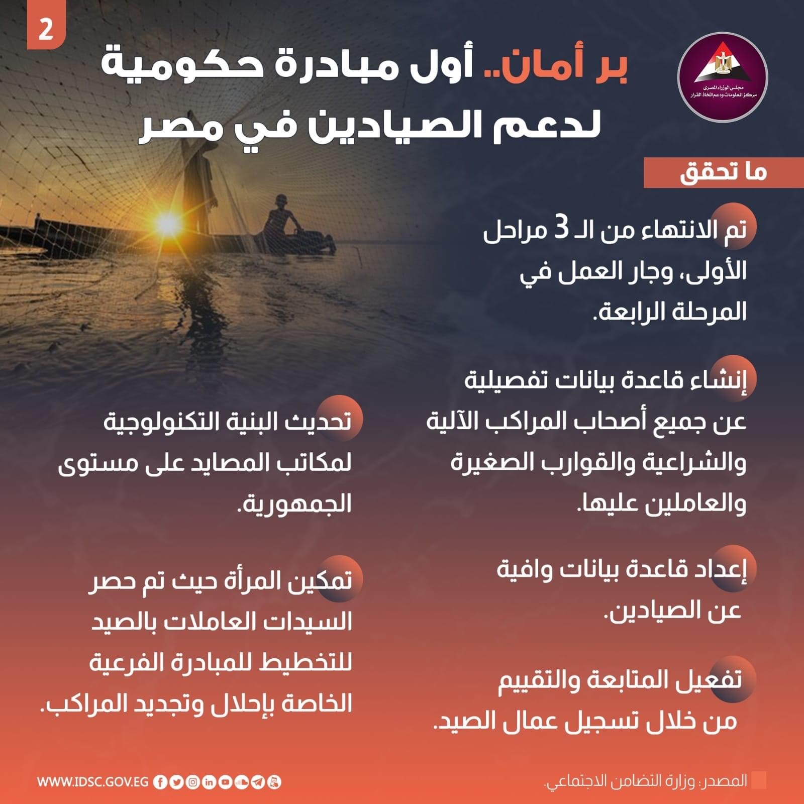 مبادرة بر امان، نشرت الصفحة الرسمية لمركز المعلومات ودعم اتخاذ القرار بمجلس الوزراء عبر موقع التواصل الاجتماعي فيس بوك انفوجراف يوضح إنجازات مبادرة بر أمان وهي أول مبادرة حكومية لدعم صغار الصيادين.