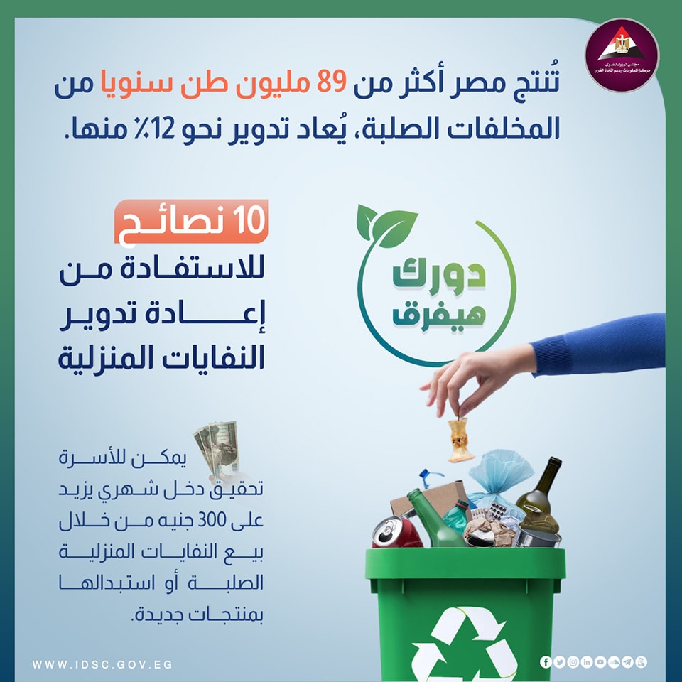 وأوضح مركز معلومات مجلس الوزراء أنه رغم أن تراكُم النفايات يُعَد مشكلة حقيقية تؤرِّق الدول لا سيما في ظل تزايد معدلات النمو السكاني وكثافة الأنشطة الاقتصادية، فإن بداخل تلك النفايات المتراكمة كنز يُدِّر أرباحًا إذا ما أُدير بشكل فعَّال. ومن هنا، اكتسب مفهوم "إعادة التدوير" زخمًا متزايدًا في الآونة الأخيرة.