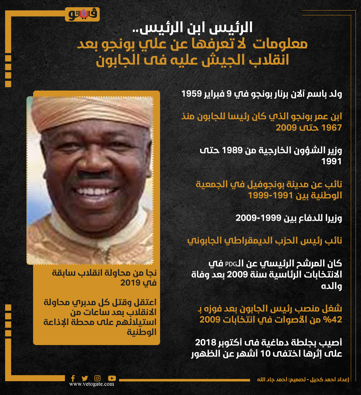 الرئيس ابن الرئيس.. معلومات لا تعرفها عن علي بونجو بعد انقلاب الجيش عليه فى الجابون (إنفوجراف) الأربعاء 30/أغسطس/2023 - 01:22 م 8/30/2023 1:22:21 PM رئيس الجابون، فيتو أحمد كحيل شارك طباعة 18 حجم الخط شارك طباعة الجابون إستيلاء الجيش على السلطة فى الجابون الإنقلاب الجابون