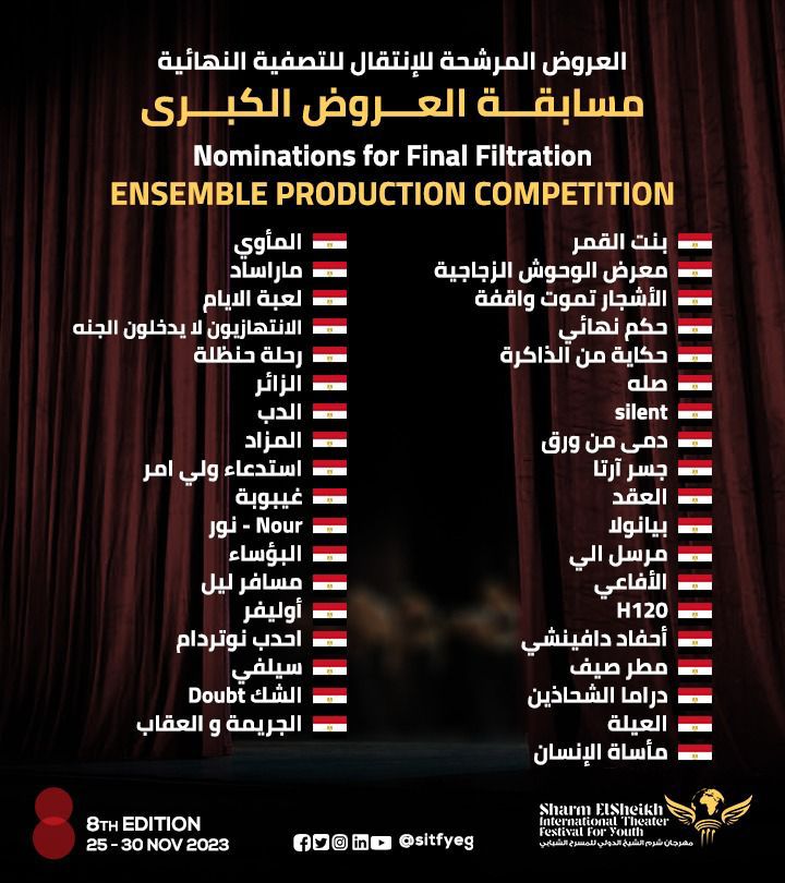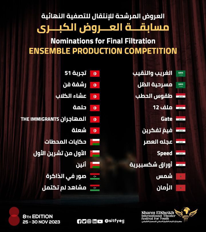 كشف مهرجان شرم الشيخ الدولي للمسرح الشبابي في دورته الثامنة برئاسة المخرج مازن الغرباوي عن القائمة القصيرة للعروض المرشحة للتصفية النهائية بمسابقات المهرجان.