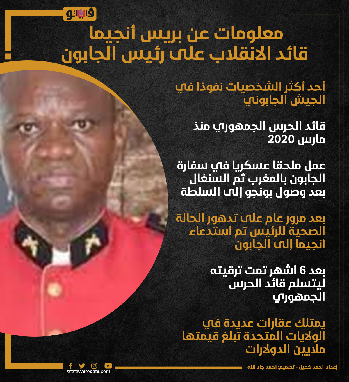 معلومات عن بريس أنجيما قائد الانقلاب على رئيس الجابون (إنفوجراف) الأربعاء 30/أغسطس/2023 - 06:13 م 8/30/2023 6:13:45 PM قائد إنقلاب الجابون، فيتو أحمد كحيل شارك طباعة 18 حجم الخط شارك طباعة الجابون إستيلاء الجيش على السلطة فى الجابون الإنقلاب الجابون قائد إنقلاب الجابون