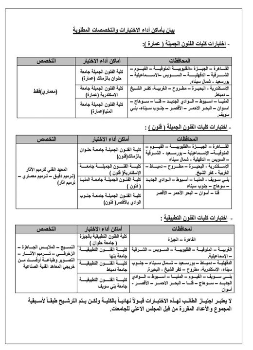 • كليات الفنون الجميلة "عمارة – فنون" بجامعات (حلوان – الإسكندرية – المنيا – جنوب الوادي بالأقصر {فنون} فقط).