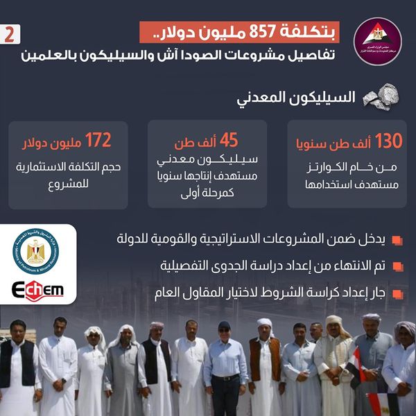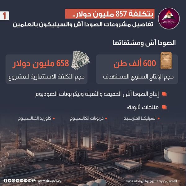 نشرت الصفحة الرسمية لمركز معلومات مجلس الوزراء على موقع التواصل الاجتماعي فيسبوك تفاصيل إنشاء مصنع لإنتاج الصودا آش ومشتقاتها إلى جانب مصنع آخر لإنتاج السيليكون المعدني.