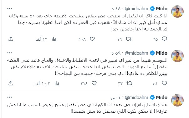 وكتب أحمد حسام ميدو تغريدة على "تويتر"، منصة إكس الحالية، عن الموسم الكروي الجديد "الموسم المحلي راجع تاني شوية أشخاص اتغيروا لكن نفس منهج... متغيرش منه حاجه شايف إن في محاولة لتذكير الجماهير بمنهج... اوعوا تنسوا... إن إحنا فشله... افتكر كويس انت بتتعامل مع مين!"