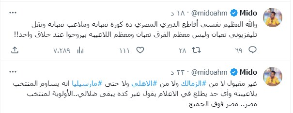 ووجه اللوم للأهلي والزمالك في أزمة لاعبي المنتخب فقال: "غير مقبول لا من #الزمالك ولا من #الاهلي ولا حتى #مارسيليا انه يساوم المنتخب بلاعيبته وأي حد يطلع في الاعلام يقول غير كده يبقى ضلالي..الأولوية لمنتخب مصر.. مصر فوق الجميع"