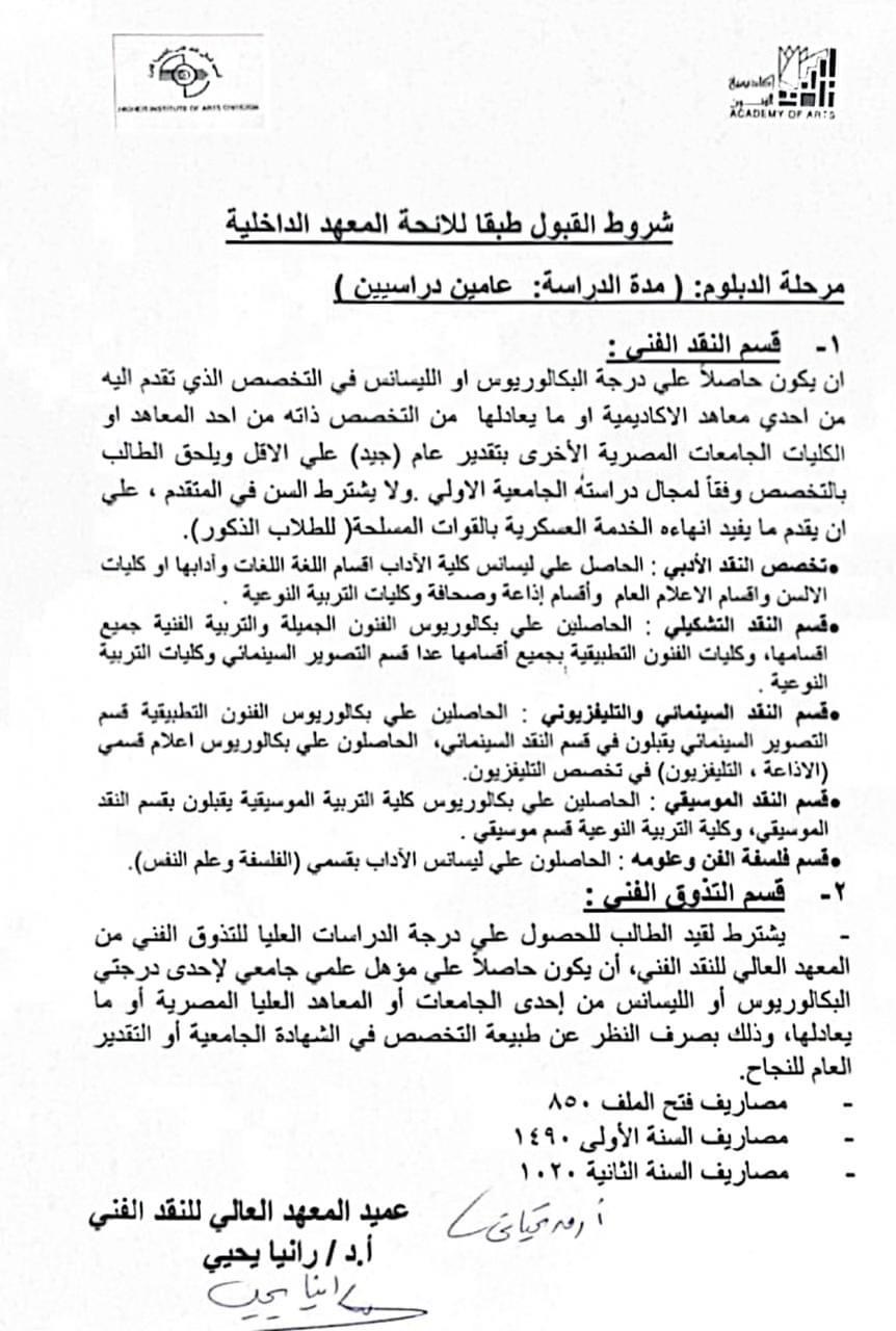 تلقى كرم جبر، رئيس المجلس الأعلى لتنظيم الإعلام، خطابا من الدكتورة رانيا يحيى، عميد المعهد العالي للنقد الفنى لتيسير مهمة الراغبين من الصحفيين والإعلاميين للدراسة بالمعهد للحصول على دبلومة النقد الفني أو التذوق الفني كل حسب شهادته الجامعية، وذلك للعام الجامعي 2023/2024، علمًا بأن آخر موعد للقبول بالمعهد يوم ١٤ سبتمبر.