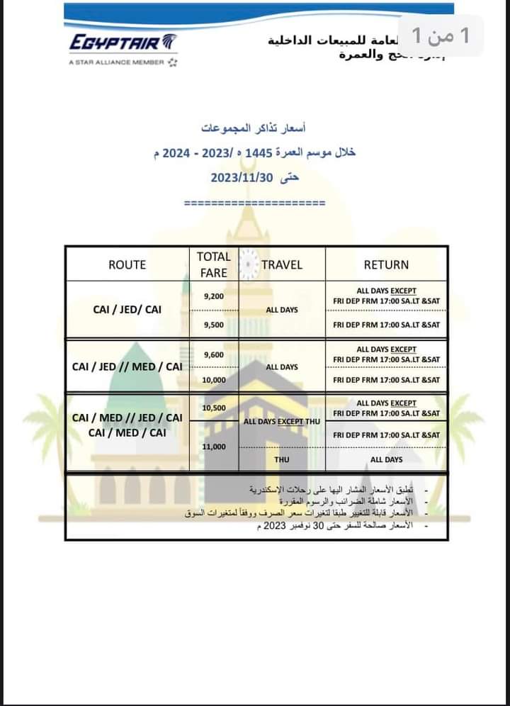 خطوط شركة مصر للطيران لسفر المعتمرين