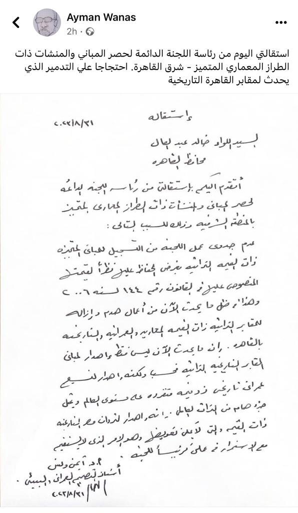 السيد اللواء خالد عبد العال محافظ القاهرة، أتقدم إليكم باستقالتي من رئاسة اللجنة الدائمة للمباني والمنشآت ذات الطراز المعماري المتميز لحصر بالمنطقة الشرقية وذلك للسبب التالي: