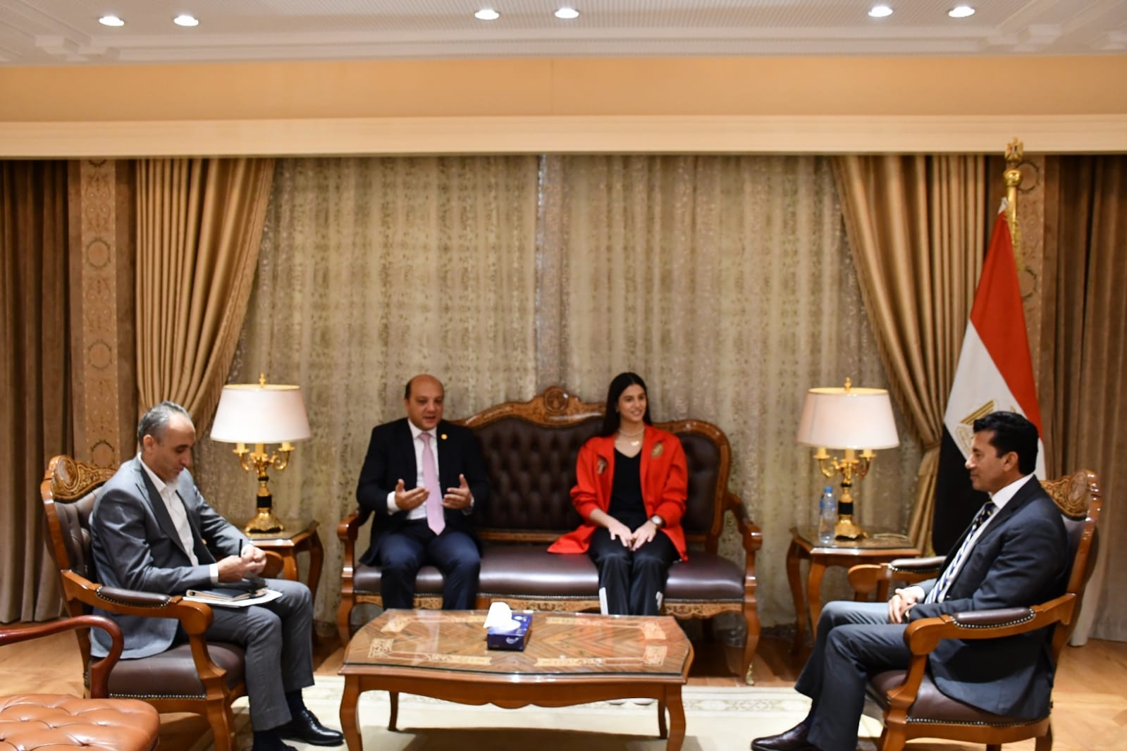 حضر اللقاء الدكتور إيهاب أمين رئيس الاتحادين المصري والإفريقي لـ الجمباز وعضو المكتب التنفيذي للاتحاد الدولي،الدكتور محمد الكردي رئيس الادارة المركزية للأداء الرياضي، والدكتور عبد الأول محمد مساعد وزير الشباب والرياضة.