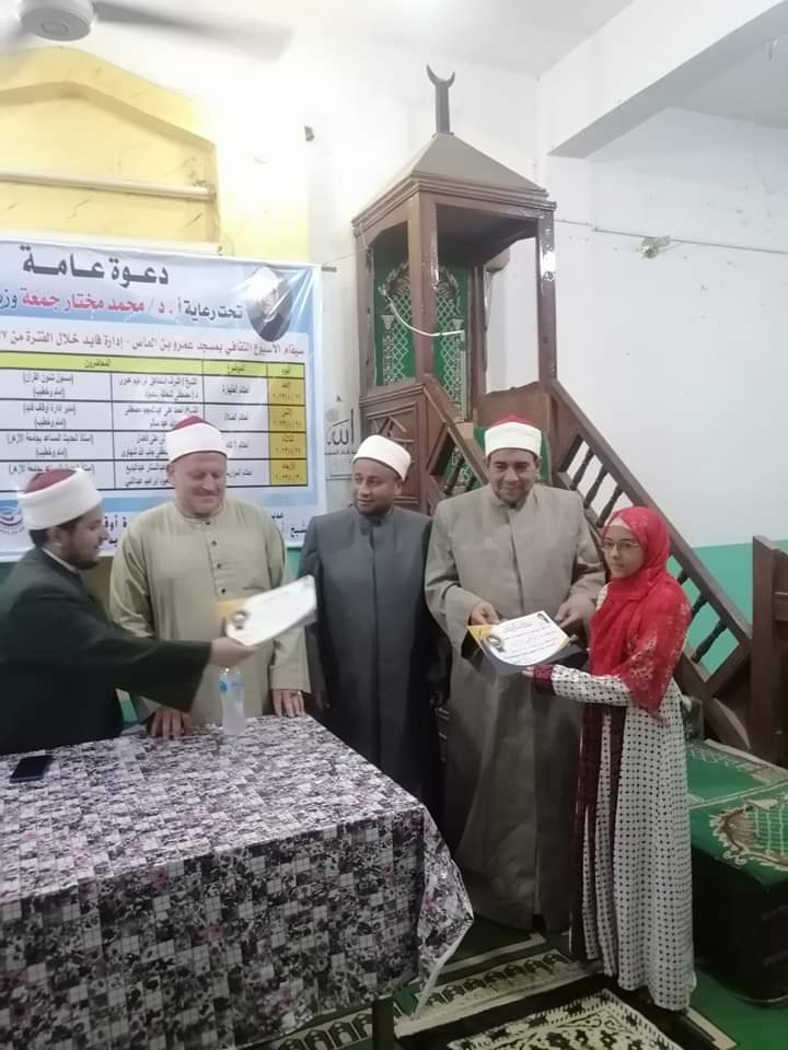 وشهد مراسم التكريم كل من فضيلة الشيخ أشرف العدوي مسئول شئون القرآن بمديرية أوقاف الإسماعيلية وفضيلة الشيخ أحمد على عبد المجيد مدير إدارة أوقاف فايد، والشيخ أحمد جاب الله.