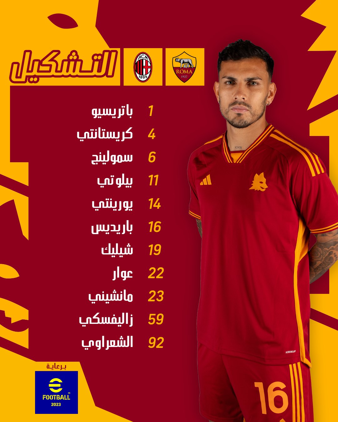 روما وميلان، أعلن البرتغالي جوزيه مورينيو المدير الفني لنادي روما الإيطالي عن التشكيل الرسمي لفريقه في لقاء الليلة أمام ميلان ضمن منافسات الجولة الثالثة من الدوري الإيطالي.