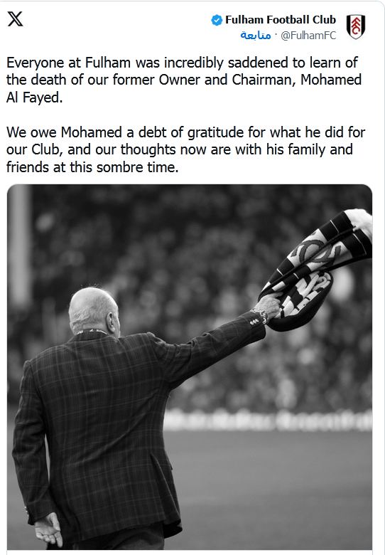 وكتب النادي الإنجليزي، عبر حسابه الرسمي على منصة إكس: «شعر الجميع في فولهام بالحزن الشديد عندما علموا بوفاة مالكنا ورئيس مجلس الإدارة السابق محمد الفايد».