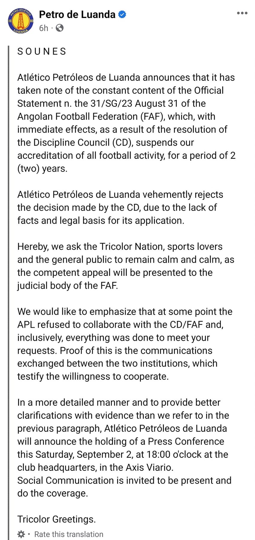 أعلن نادي بترو أتلتيكو فى بيان رسمي له، إيقافه من الاتحاد الأنجولي عن ممارسة النشاط الرياضي لمدة عامين.