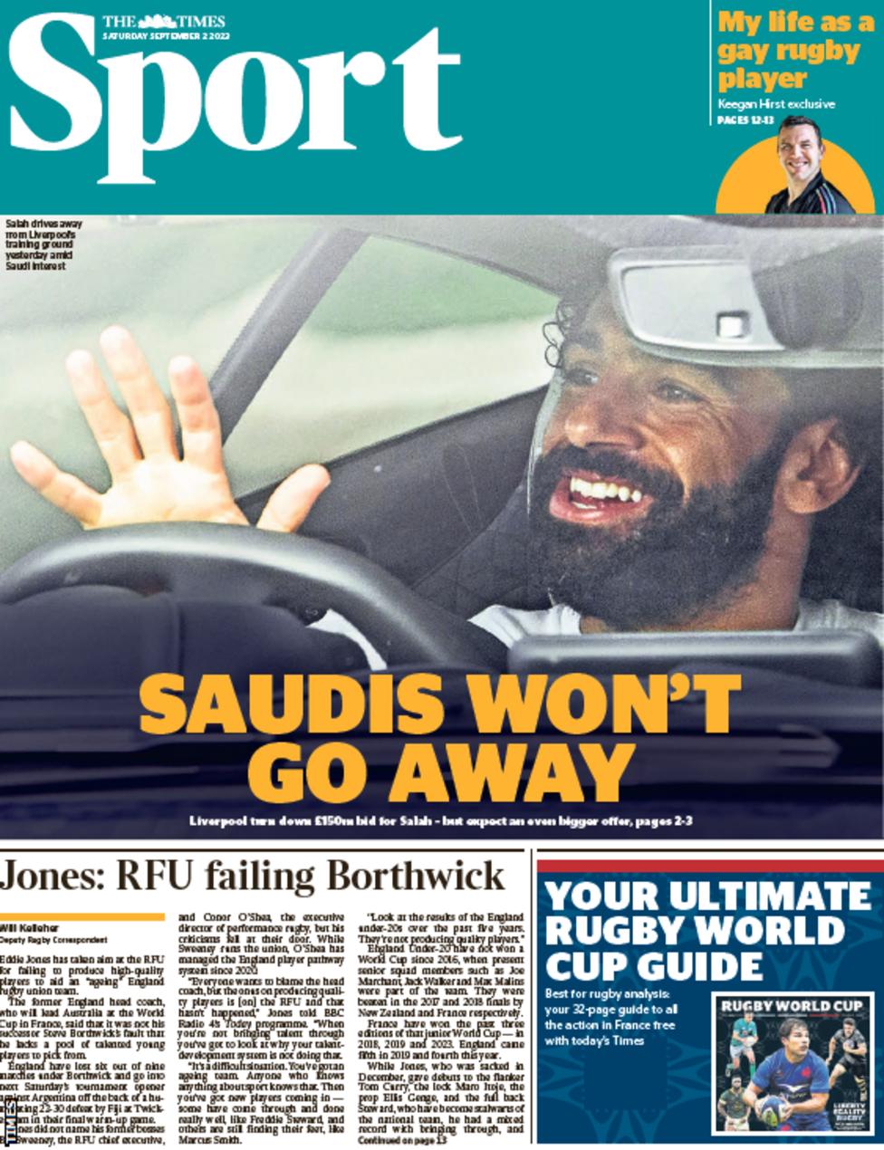 وكتبت صحيفة "التايمز": "السعوديون لن يرحلوا.. ليفربول يرفض عرضًا بقيمة 150 مليون إسترليني من أجل صلاح.. ولكن توقع عرضًا أكبر".