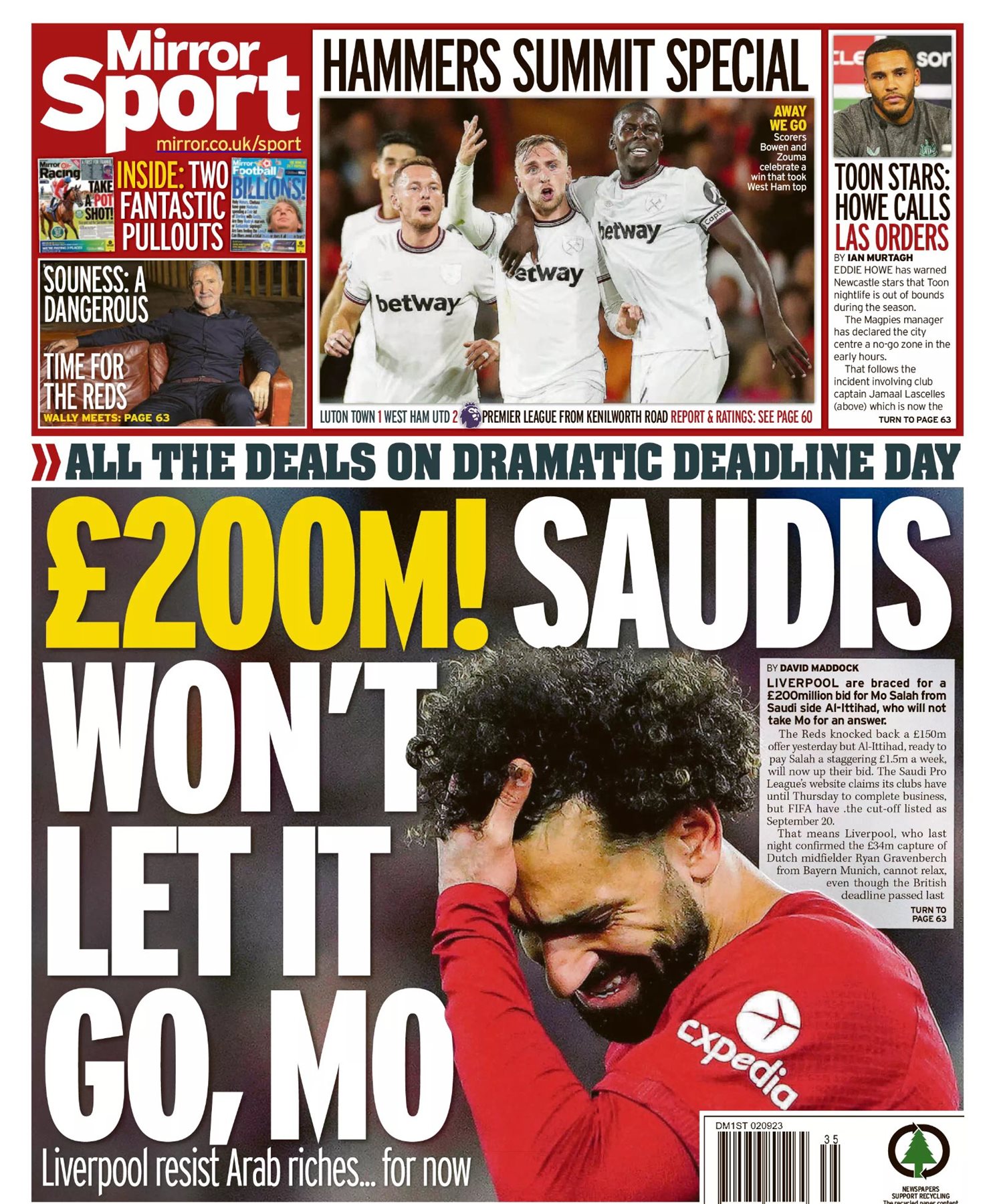 فيما عنونت صحيفة "ميرور": "200 مليون إسترليني.. السعوديون لن يتركوا مو.. ليفربول يقاوم أغنياء العرب.. إلى الآن".