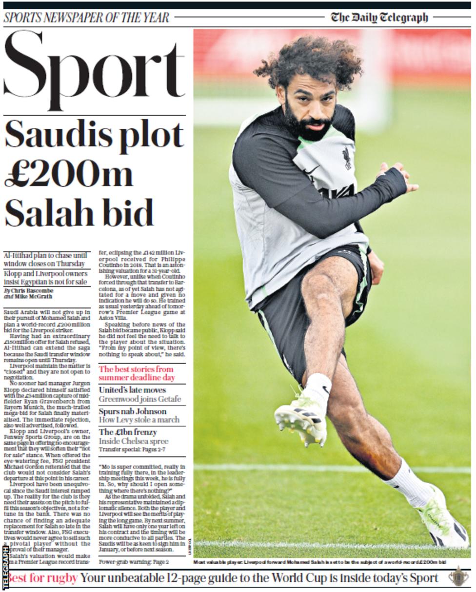 أما صحيفة "ديلي تلجراف" فعنونت: "السعوديون يخططون لعرض بقيمة 200 مليون إسترليني لصلاح.. الاتحاد يخطط للمطاردة حتى نهاية سوق الانتقالات يوم الخميس.. كلوب وملاك ليفربول يصرون على أن المصري ليس للبيع".
