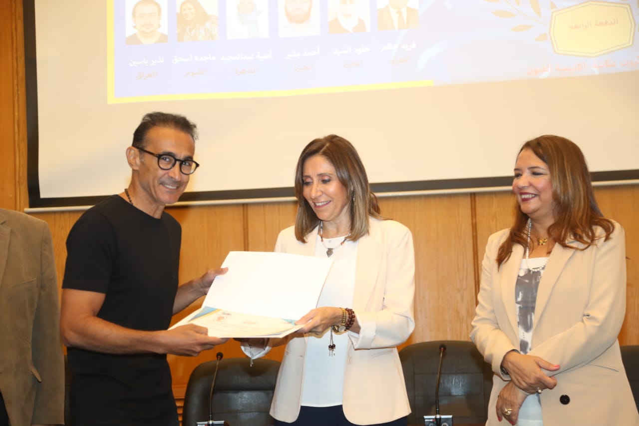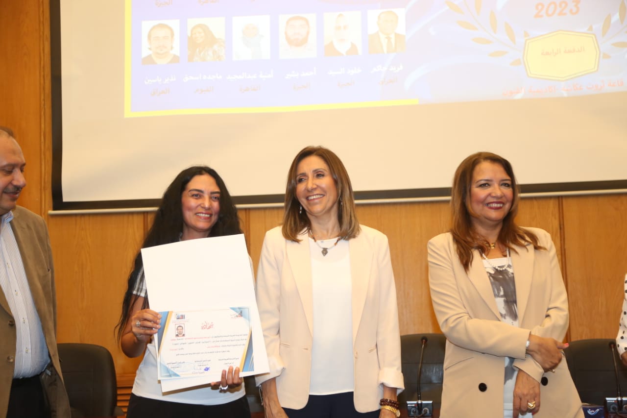 سلمت الدكتورة نيفين الكيلاني وزيرة الثقافة، والدكتورة غادة جبارة، رئيس أكاديمية الفنون شهادات التخرج لطلبة الدفعة الرابعة للمدرسة العربية للسينما والتليفزيون عن بُعد، والبالغ عددهم 24 خريجًا، والتي تُعد الدفعة الأولى بعد انتقال تبعية المدرسة من صندوق التنمية الثقافية لأكاديمية الفنون.