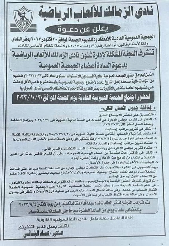 ووجهت اللجنة الدعوة للجمعية العمومية العادية لنادي الزمالك للانعقاد، وذلك يوم الجمعة الموافق 20 أكتوبر، بمقر النادي، وفقًا لأحكام قانون الرياضة رقم 71 لسنة 2017، ولائحة النظام الأساسي للنادي.