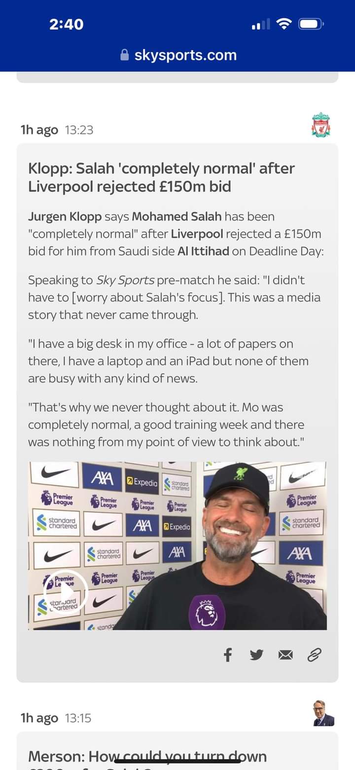 وأشارت الصحيفة السعودية أن ليفربول يماطل ويريد مد فترة المفاوضات مع اتحاد جدة السعودي، حتى الساعات الأخيرة من انتهاء فترة الانتقالات الصيفية الحالية في الدوري الإنجليزي، من أجل ضمان الحصول على أعلى سعر مقابل بيع محمد صلاح.