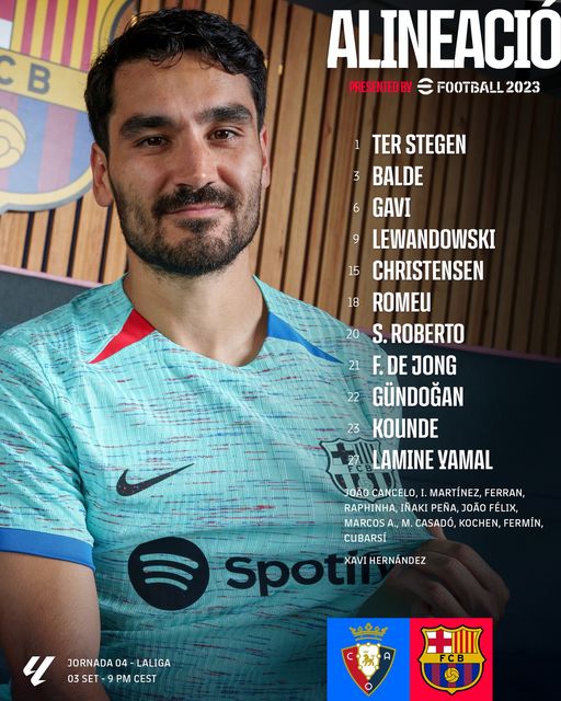 الدوري الإسباني، أعلن تشافي هيرنانديز مدير فني فريق برشلونة عن تشكيل فريقه لمواجهة أوساسونا في الجولة الرابعة من الليجا وتقام المباراة علي ملعب السادار معقل فريق أوساسونا.