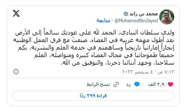 وقال بن زايد في منشور له على منصة "X": "ولدي سلطان النيادي، الحمد لله على عودتك سالما إلى الأرض بعد أطول مهمة عربية في الفضاء".