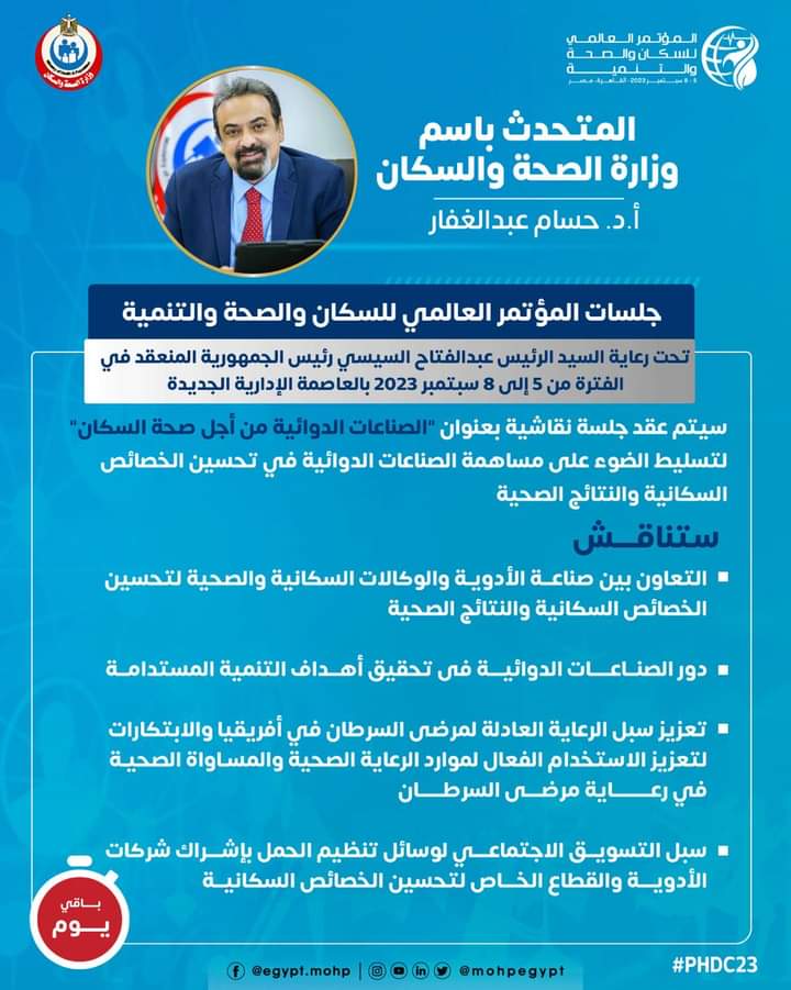 كشف الدكتور حسام عبدالغفار، المتحدث باسم وزارة الصحة والسكان عن تفاصيل جلسات المؤتمر العالمي للسكان والصحة والتنمية تحت رعاية الرئيس عبدالفتاح السيسي رئيس الجمهورية المنعقد في الفترة من 5 إلى 8 سبتمبر 2023 بالعاصمة الإدارية الجديدة.
