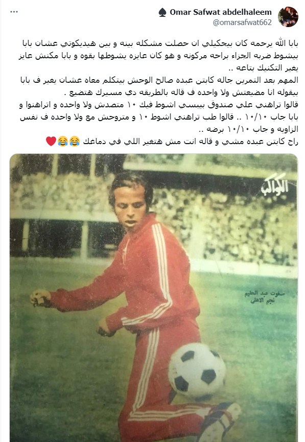 وتابع نجل كابتن صفوت عبد الحليم حكاية والده فقال: "المهم بعد التمرين جاله كابتن عبده صالح الوحش بيتكلم معاه عشان يغير ف بابا بيقوله انا مضيعتش ولا واحده فقاله بالطريقه دي مسيرك هتضيع."